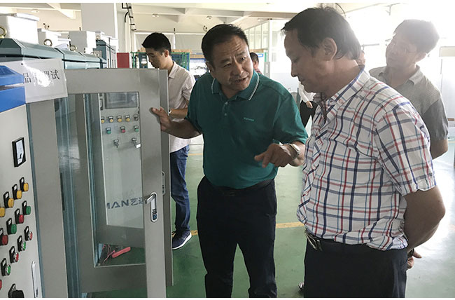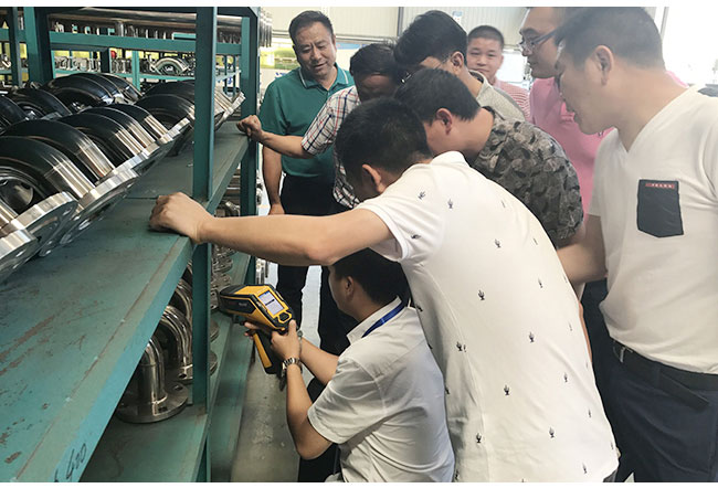 随后,在蒋总、朱总的陪同下,考察团来到生产车间,对设备生产和检测的各个环节进行了详细的实地考察与论证。在考察过程中,双方在技术上也有了很多的交流,并且深入的讨论我们的工艺特点。