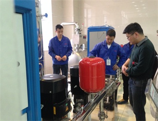 在蒋总的陪同下,港仪水司胡经理、徐经理逐个参观了我司电控车间、水泵生产车间和成套车间,对我司的生产加工技术非常感兴趣,并在展厅重点参观了无负压供水设备。